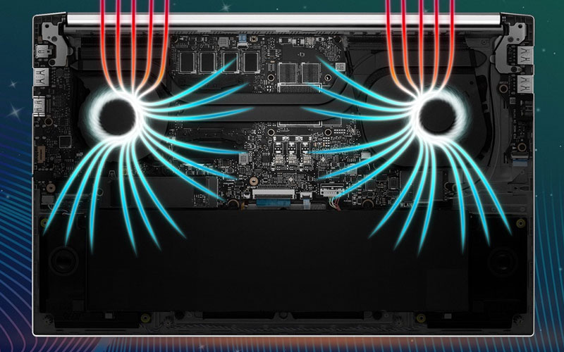 مادربُرد: چینش +L‑shape؛ یک فن + دو هیتپایپ مسی 6 میلیمتری روی CPU و GPU مشترک. VRM هفت فاز (۴ برای CPU، ۳ برای GPU). پَد گرمایی روی ماسفتها کافی است ولی هِدروم اورکلاک صفر.