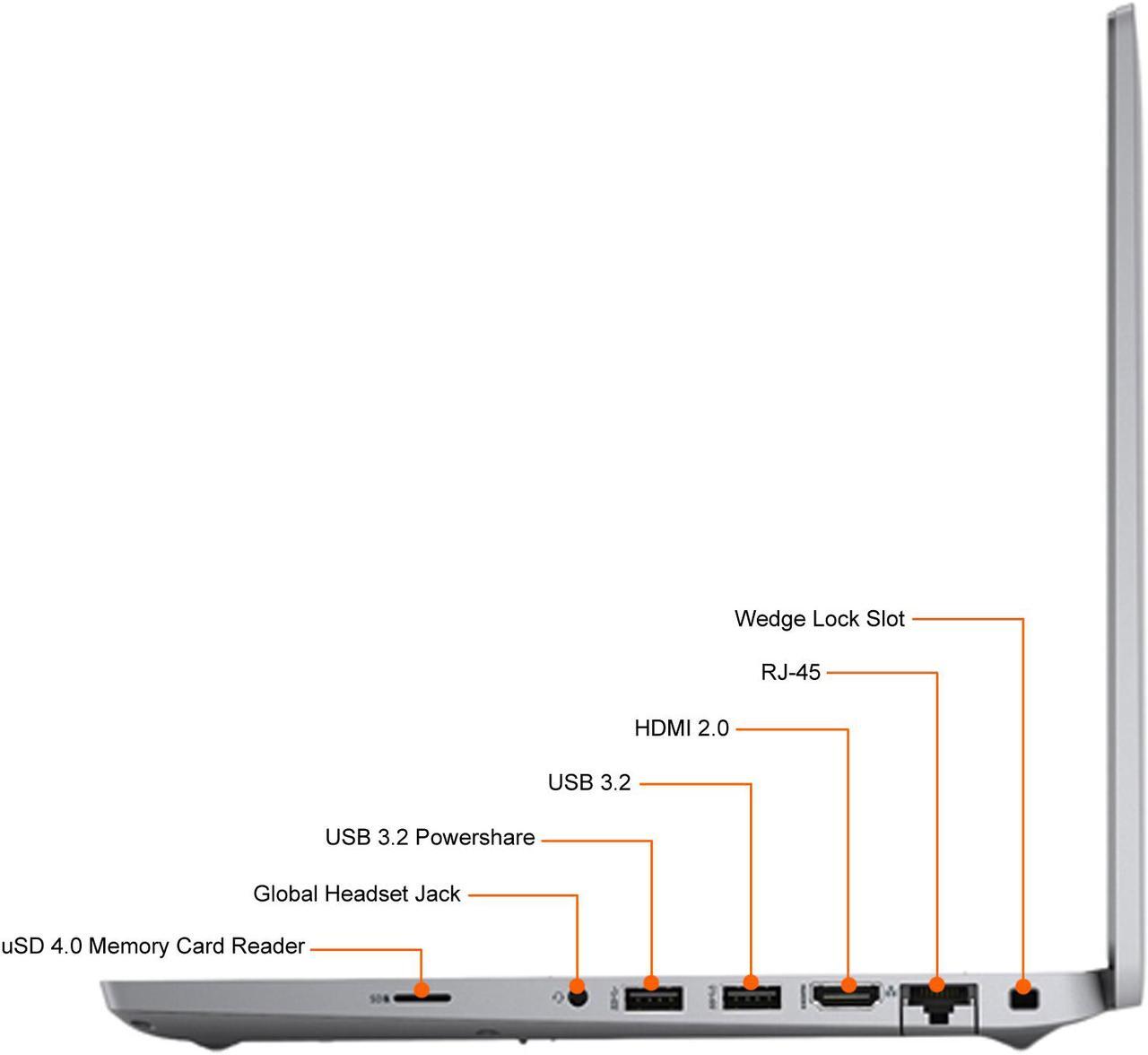 • ۲× USB 3.2, ۱× USB-C (با قابلیت شارژ و DisplayPort), HDMI, کارت‌خوان SD, جک ۳.۵mm, اتصال امنیتی (Noble Lock).