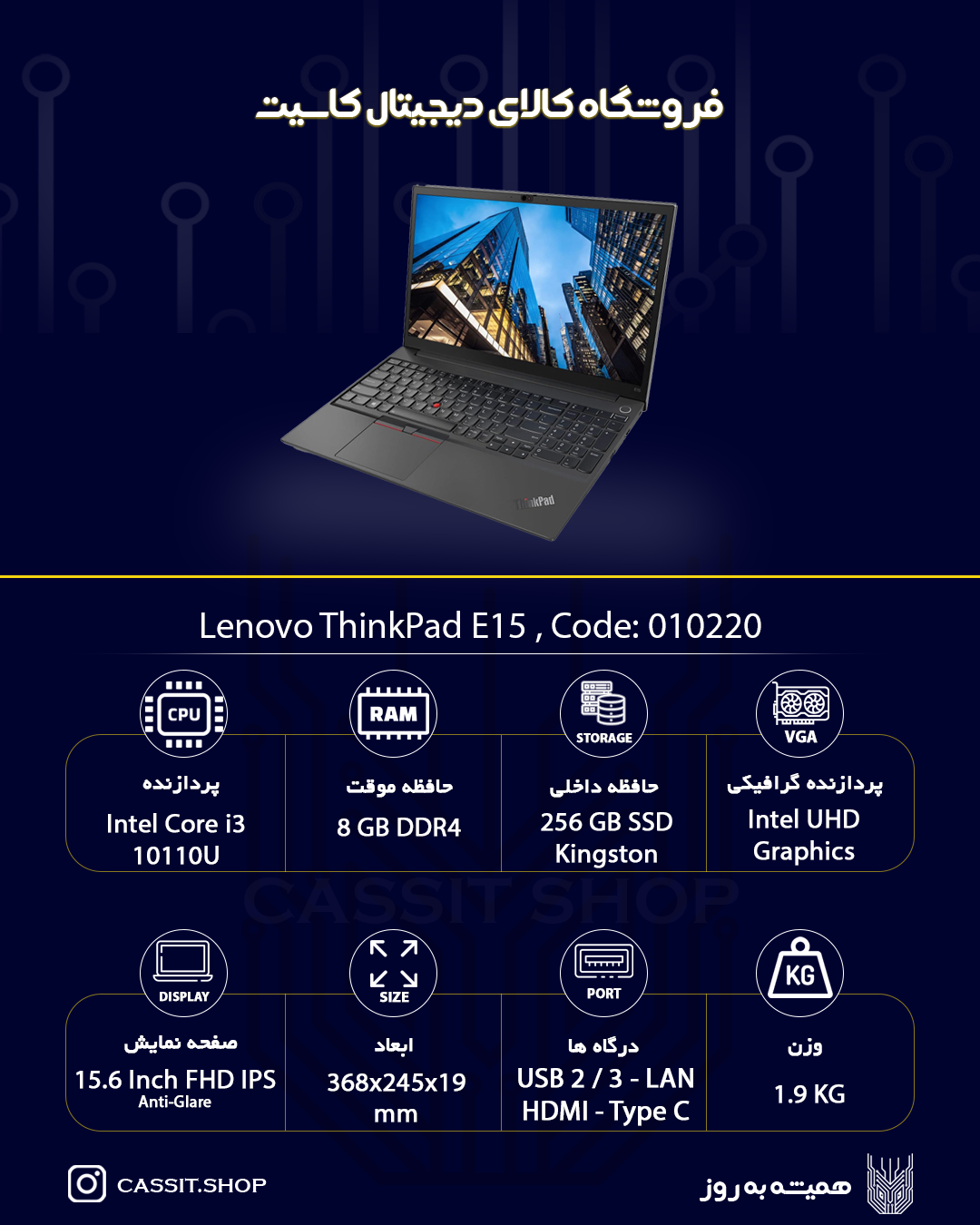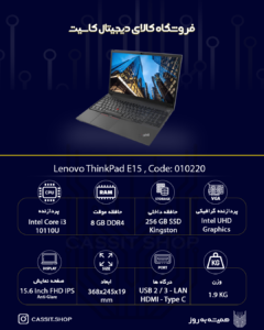 لپتاپ Lenovo مدل Lenovo ThinkPad E15، صفحهی نمایش 15.6 اینچی FHD، پردازنده Intel Core i3 10110U، رم 8GB، حافظه 256GB SSD، گرافیک Intel UHD Graphics| استوک A++